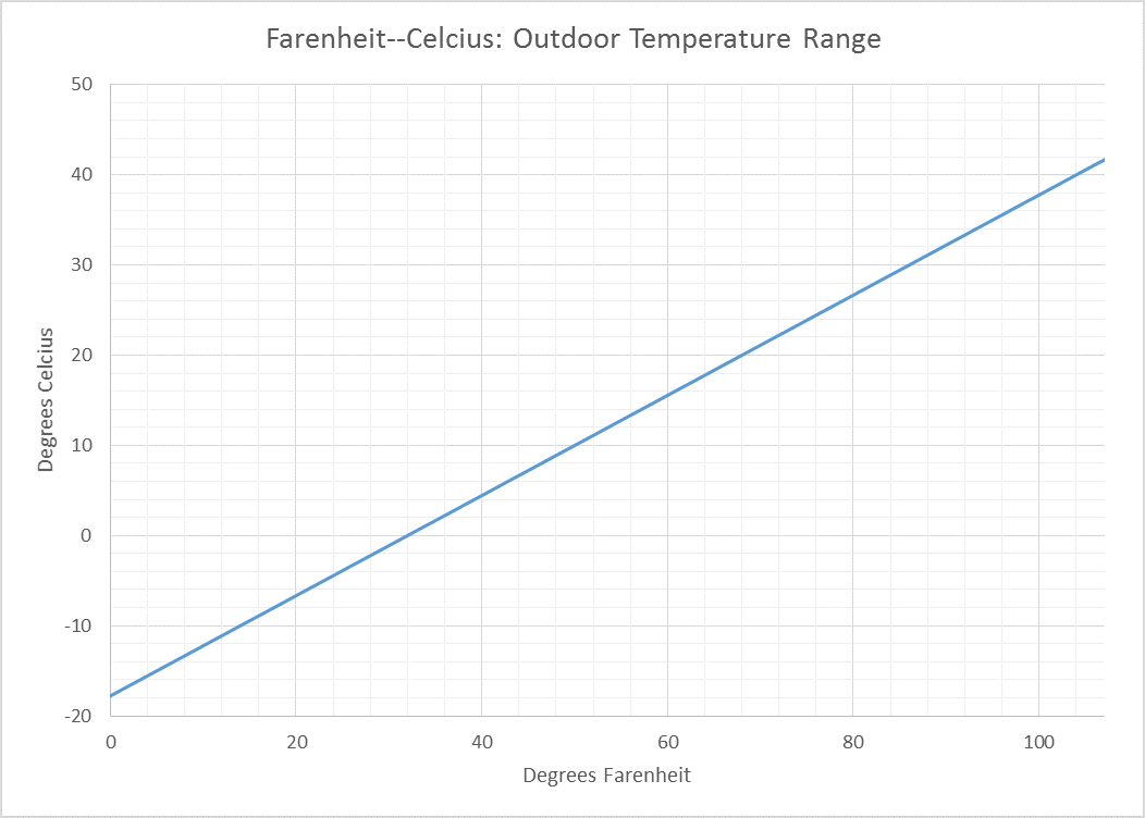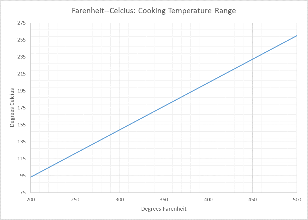 To think about outdoor weather and cooking temperatures with reference points based on water, here are some charts that will help. The charts are based on the below formula based on the linear relationship between the temperature scales.