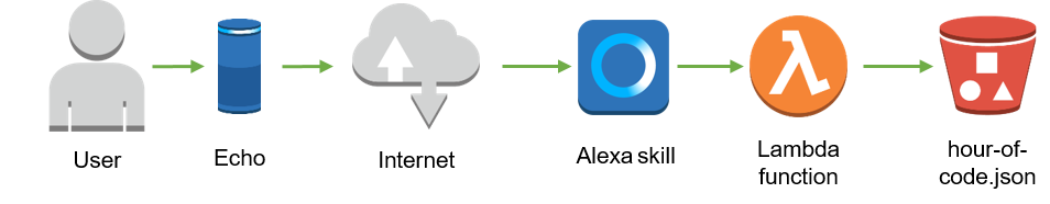 Today for hour of code, I will demo a simple Alexa app (skill) using the Amazon Echo. While the app seems really simple from the user's point of view, it is really cool to think about everything that is going on behind the scenes.